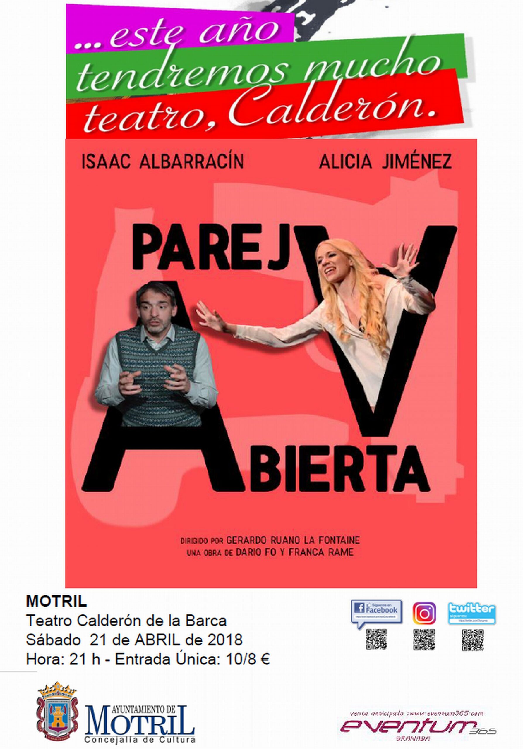 Los amantes del teatro en Motril y la Costa Tropical tienen una cita ineludible este sábado con la puesta en escena de la obra Pareja Abierta, escrita por el Premio Nobel de Literatura italiano Darío Fo y la también transalpina Franca Rame. El área de Cultura ha programado esta interesante representación dentro del Ciclo de Teatro Profesional, que está trayendo a la capital de la Comarca obras de calidad, premiadas internacionalmente y que hacen reflexionar al público.