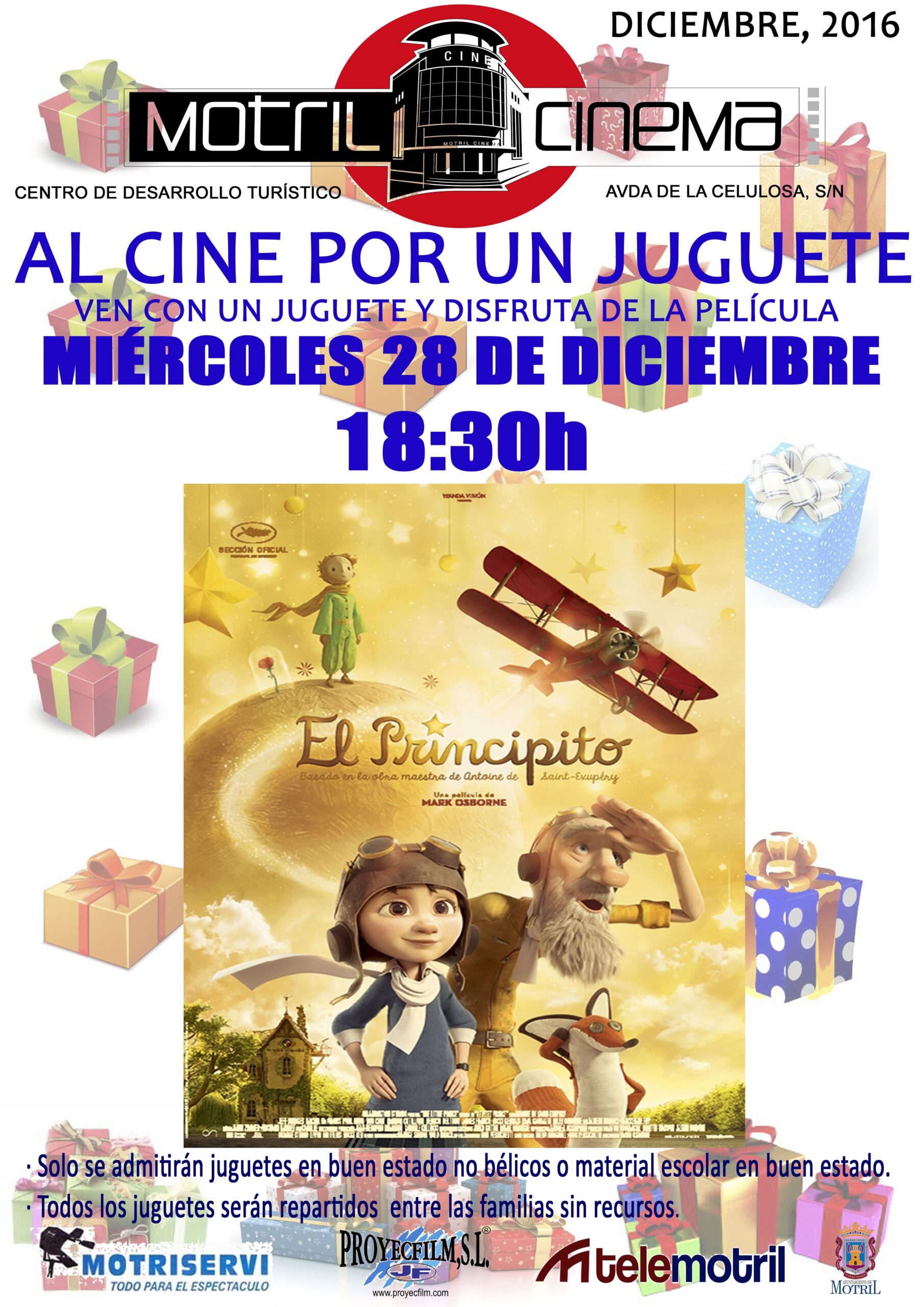Motril mostrará este miércoles de nuevo su condición de ciudad solidaria con la iniciativa ‘Al Cine por un Juguete’, organizada por Motril Cinema con la colaboración de la concejalía de Inmigración del Ayuntamiento de Motril, Motriservi, Proyecfilm y Telemotril. La iniciativa tiene como objetivo recaudar juguetes en buen estado para repartirlos entre las familias motrileñas con menos recursos y para ello, se proyectará, en una función única a partir de las 18.30 horas en el auditorio del Centro de Desarrollo Turístico, la película de dibujos animados ‘El Principito’.
